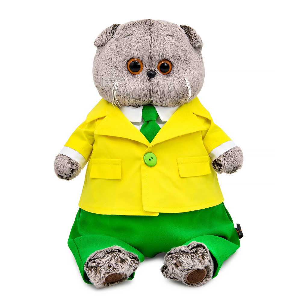 Кот Басик в классном ярком костюме в оттенках лета. В комплектацию костюма входят лимонный классический пиджак из плотной ткани на одной зелёной пуговке, ярко-зелёные брюки, белоснежная рубашка и зелёный галстук в тон брюк.
