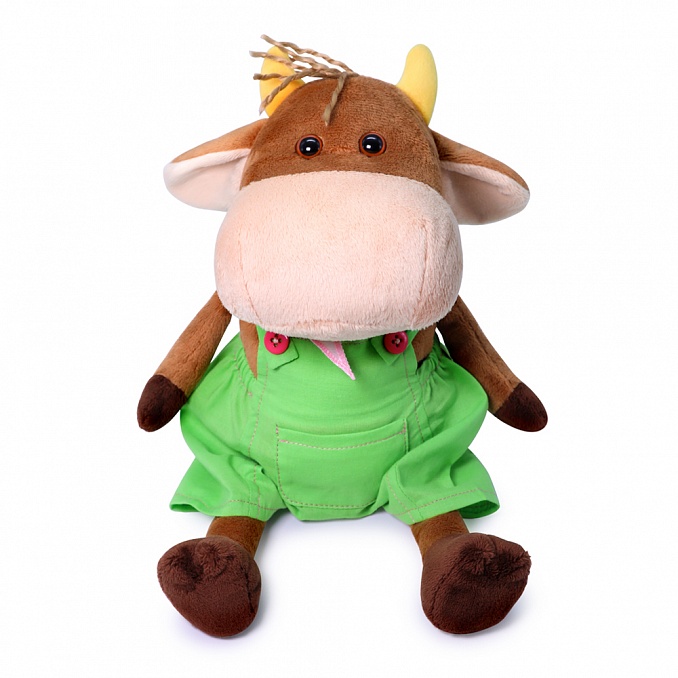Маленький бычок Гордей в стильном комбинезоне из плотной х/б ткани сочного салатового цвета. Комбинезон сшит на лямочках, с кармашком спереди и отделан контрастной строчкой. Также на шее Гордея повязана косыночка-банданка из нежно-розового хлопка в мелкий белый горошек.