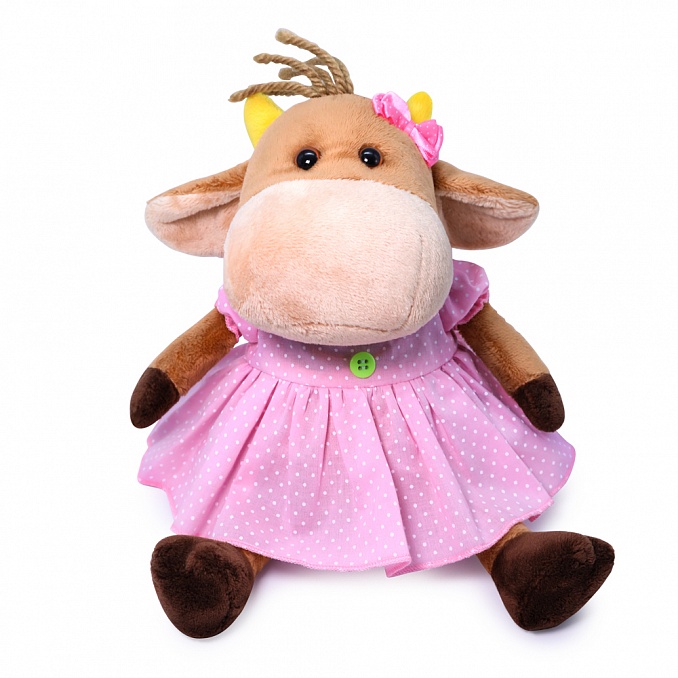 Маленькая коровка Герда в трогательном платьице нежно-розового цвета в мелкий беленький горошек. Платье сшито отрезным по талии, с рукавом-фонарик и застёжкой сзади. Спереди платье украшают контрастные пуговки, а по горловине идёт контрастный кант. На голове у Герды маленький атласный бантик.