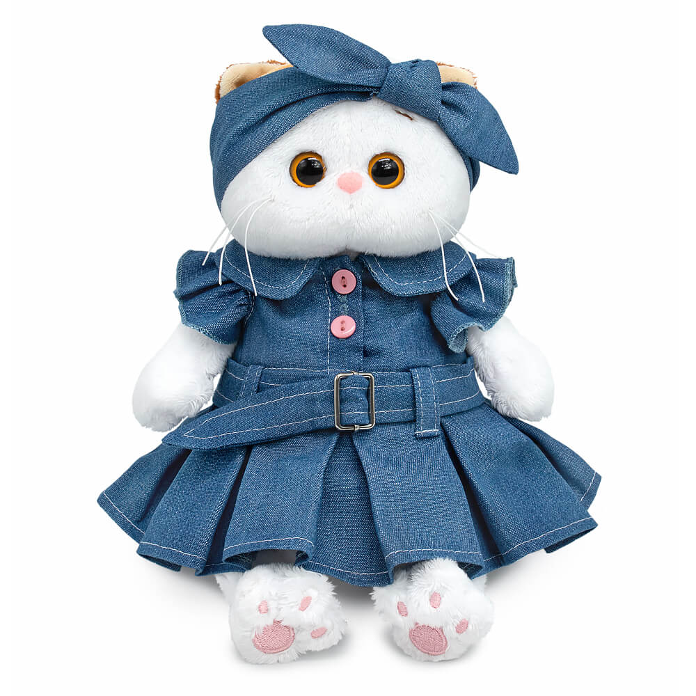 Кошечка Ли-Ли в модном платье из денима синего цвета с серым оттенком. Платье сложного кроя, отрезное по талии, с застёжкой на розовые пуговки, закруглённым воротничком, крылышками и пышной юбкой. Платье сшито с пояском с серебристой пряжкой, продетым в шлёвки. Всё платье отделано контрастной строчкой. На голове у Ли-Ли милый аксессуар в виде ободка-платочка.