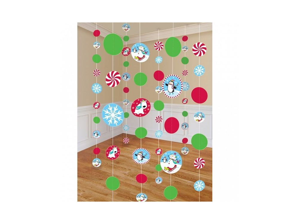 8 вертикальных гирлянд, декорированных яркими цветными кругами с изображением Снеговика и его друзей - отличный вариант декора на Новый Год.