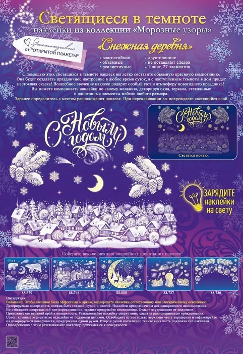 Наклейки подходят для любых гладких поверхностей (кроме бумажных обоев). Кроме того, они двусторонние – а это удачное решение для декорирования окон, витрин, стеклянных дверей. Они одинаково эффектно смотрятся и изнутри, и снаружи. Легко клеятся и легко снимаются, не оставляя следов. Влагостойкие. Перед использованием, зарядите наклейки на свету.