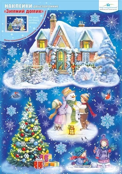 Прекрасная снежная зима, где дети лепят снеговика и катаются на санках во дворе сказочно уютного загородного домика! И, конечно, здесь же стоит празднично украшенная ёлка, летают яркие снегири и большие волшебные снежинки! Цветная композиция волшебно искрится и переливается блёстками, создавая приятную тёплую атмосферу! Двусторонние наклейки «Новогодний пейзаж» на прозрачной плёнке легко приклеиваются на окно, витрину, стены, снимаются, не оставляя следов.